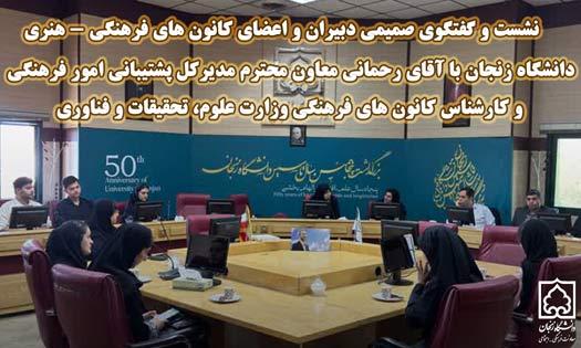 نشست و گفتگوی صمیمی دبیران و اعضای کانون های فرهنگی - هنری دانشگاه زنجان با آقای رحمانی معاون محترم مدیرکل پشتیبانی امور فرهنگی و کارشناس کانون های فرهنگی وزارت علوم، تحقیقات و فناوری در این نشست که مسئولین فرهنگی دانشگاه و کارشناس کانون های وزارت علوم نیز حضور داشتند؛ جناب آقای رحمانی فضای کانون های فرهنگی را بهترین بستر موجود برای کارهای تشکیلاتی، کسب مهارتهای ارتباطی و مدیریتی و شکوفایی توانمندی های فردی ذکر کردند. در این نشست آقای محمدامین شاهمرادی دبیرکل کانون های فرهنگی و اجتماعی، گزارشی درخصوص کسب افتخارات، توانمندی ها و فضای کانونهای دانشگاه مطرح نمودند. دیگر اعضا نیز درخصوص دغدغه های کانون های فرهنگی تبادل نظر داشته و حمایت های مادی و معنوی وزارت محترم عتف را خواستار شدند.