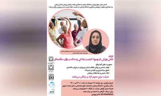 عنوان کارگاه دوم: نقش ورزش در بهبود کیفیت زندگی و سلامت روان سالمندان، مدرس: خانم دکتر اکرم کریمی اصل(دکتری تخصصی فیزیولوژی ورزشی)، روز دوشنبه ۲۸ مهرماه از ساعت ۱۲:۰۰ الی ۱۴:۰۰