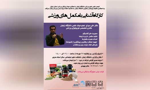 عنوان کارگاه اول: آشنایی با مکمل های ورزشی،مدرس: آقای دکتر علی سیاح (دکتری تخصصی فیزیولوژی ورزشی)، روز یکشنبه ۲۷ مهرماه از ساعت ۱۲:۰۰ الی ۱۴:۰۰