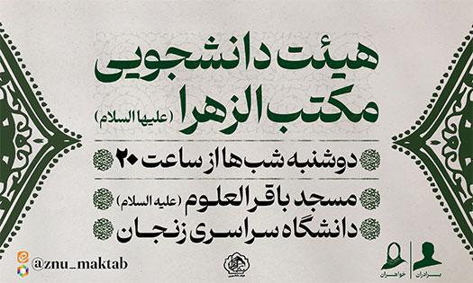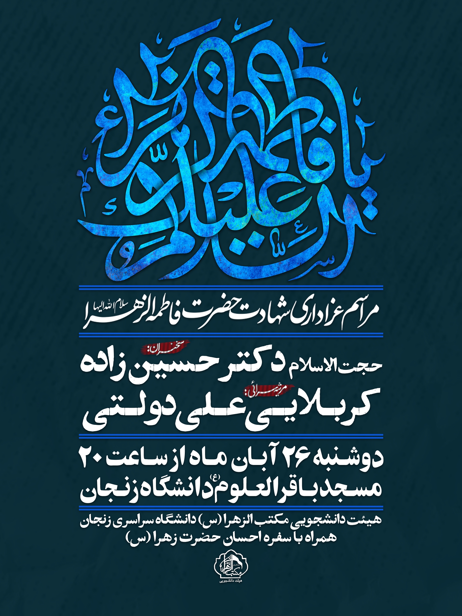 ویژه برنامه شهادت حضرت زهرا(س) سخنران: حجت الاسلام والمسلمین حسین زاده مداح: کربلایی علی دولتی زمان: دوشنبه 26 آبان، ساعت 20 مکان: مسجد باقرالعلوم علیه السلام دانشگاه با ما در کانال اطلاع رسانی هیئت دانشجویی مکتب الزهرا سلام الله علیها در پیام رسان ایتا همراه باشید https://web.eitaa.com/#@znu_maktab